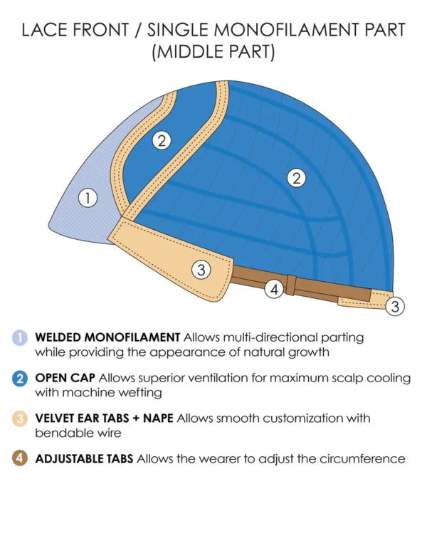 • Cap Design: Lace Front / Single Monofilament Part (center)