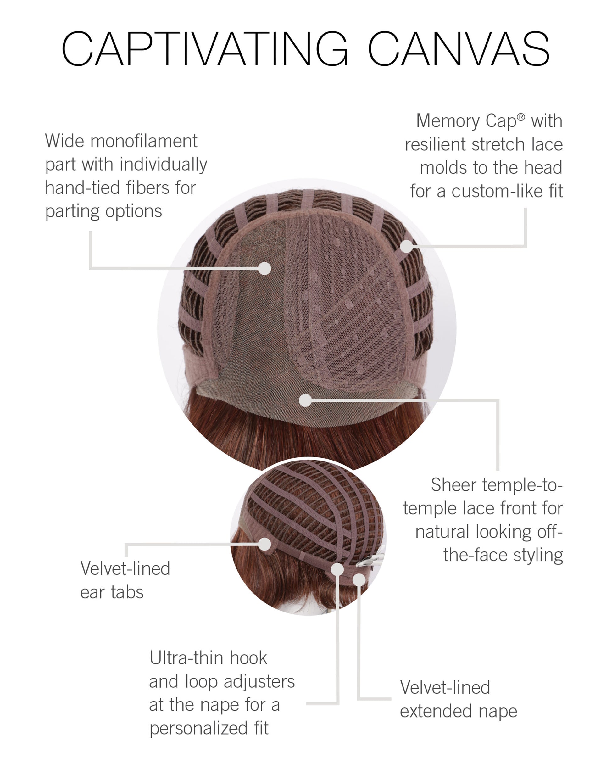 CAP DESIGN: Temple-To-Temple Lace Front, Monofilament Part, Memory Cap®, Velvet-Lined Ear Tabs, Velvet-Lined Extended Nape