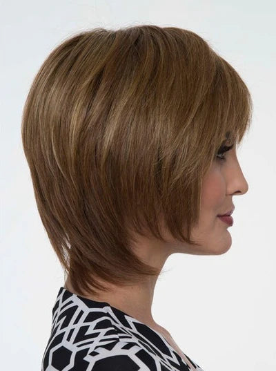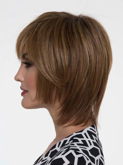 The Dena by Envy is made from our exclusive Envyhair— a blend of 30% human hair and 70% heat-friendly fiber which can be curled, straightened and blow-dried to create for a multitude of desired styles. Piecey, jaw-length layers perfectly frame the face, while brow-skimming bangs highlight the eyes. And Dena’s Mono Top construction with hand-tied sides and back allows a flawless left, right, or middle part.