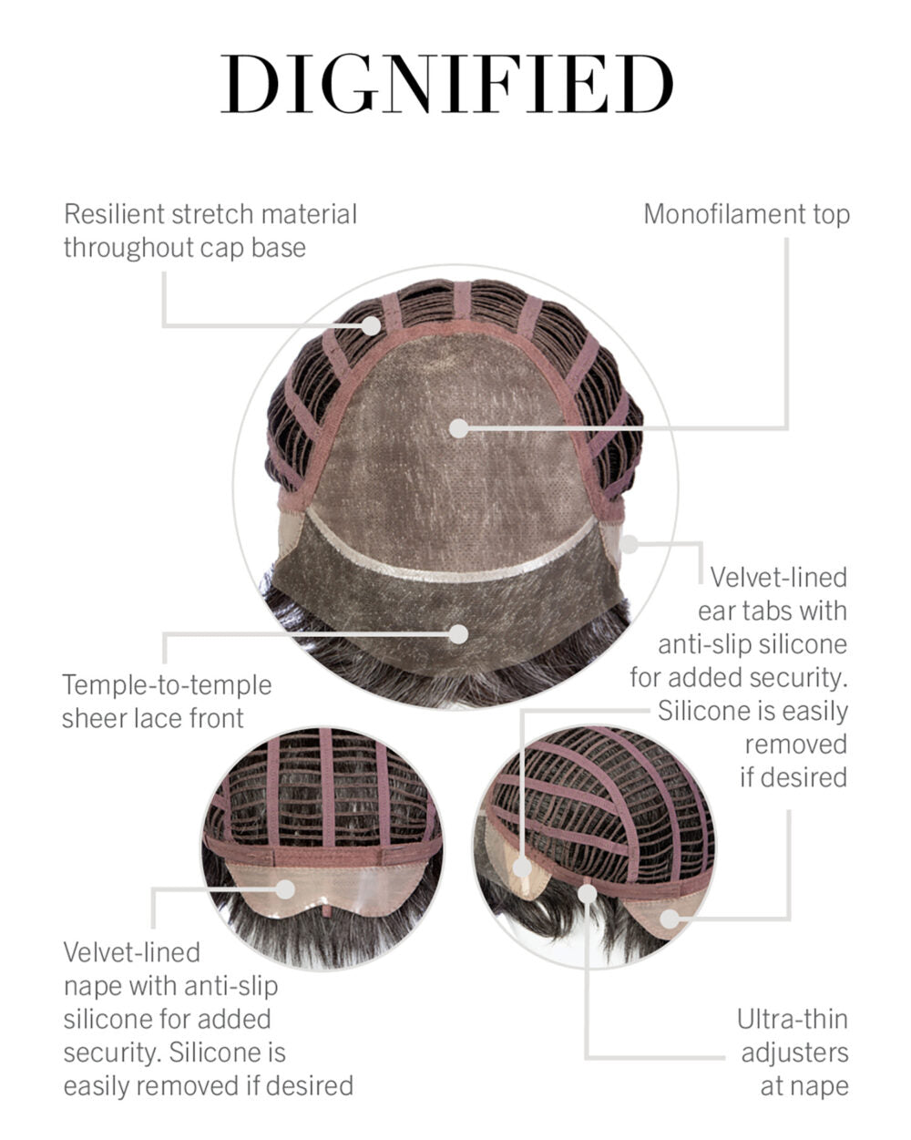 - CAP DESIGN: Temple-To-Temple Lace Front, Monofilament Top, Anti-Slip Silicone-Lined Ear Tabs, Anti-Slip Silicone-Lined Extended Nape