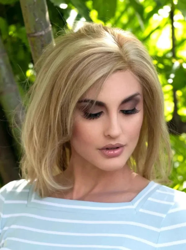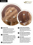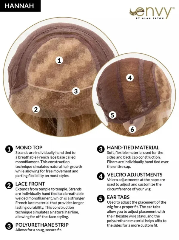 Hannah by Envy is an asymmetrical bob wig with heavy front fringe. This human hair wig offers fabulous styling versatility. The cap is 100% hand-tied with a monofilament top and lace front. These features create supremely natural comfort and movement, a natural looking hairline and the appearance of natural hair growth. Hannah is made of 100% human hair that allows you to style the wig with heat tools as you would your own hair. It looks amazing when styled sleek with its side swept bangs or styled with luscious curls. It’s available in vibrant multi-dimensional colors. The cap construction is made with built-in poly tabs and strips so that the cap can be secured for better comfort and a more confident fit.