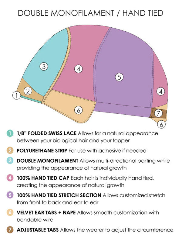 • Cap Design: Double Monofilament Top, 100% Hand Tied Cap